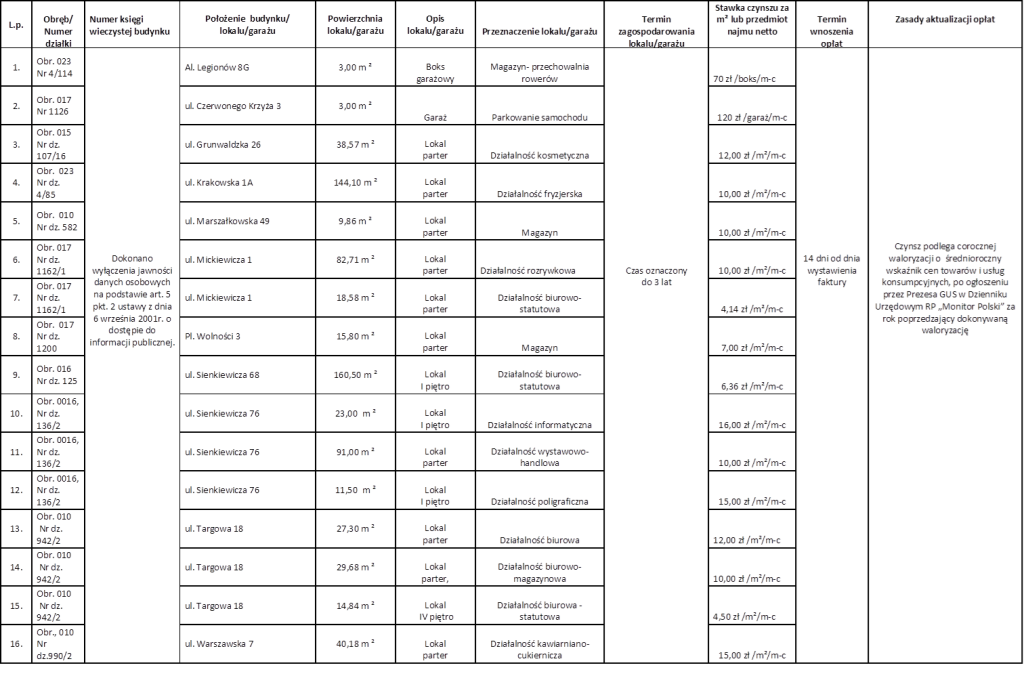 Wykaz lokali użytkowych wywiesza się na okres 21 dni, tj. od 3 kwietnia 2025r. do 24 kwietnia 2025r. do publikacji na stronie internetowej Miejskiego Zarządu Budynków w Kielcach: www.mzb.kielce.pl oraz na łamach lokalnej Gazety Wyborczej.